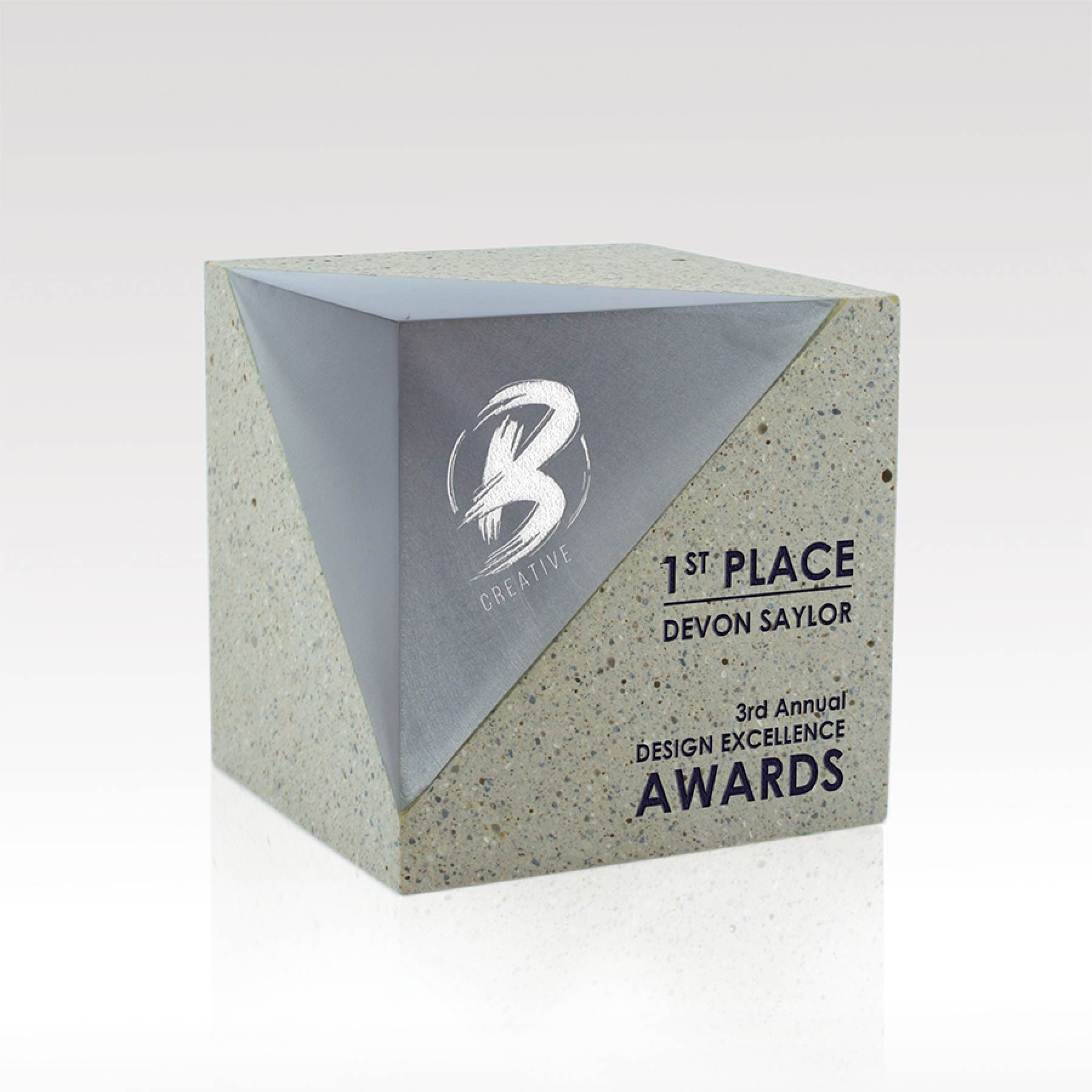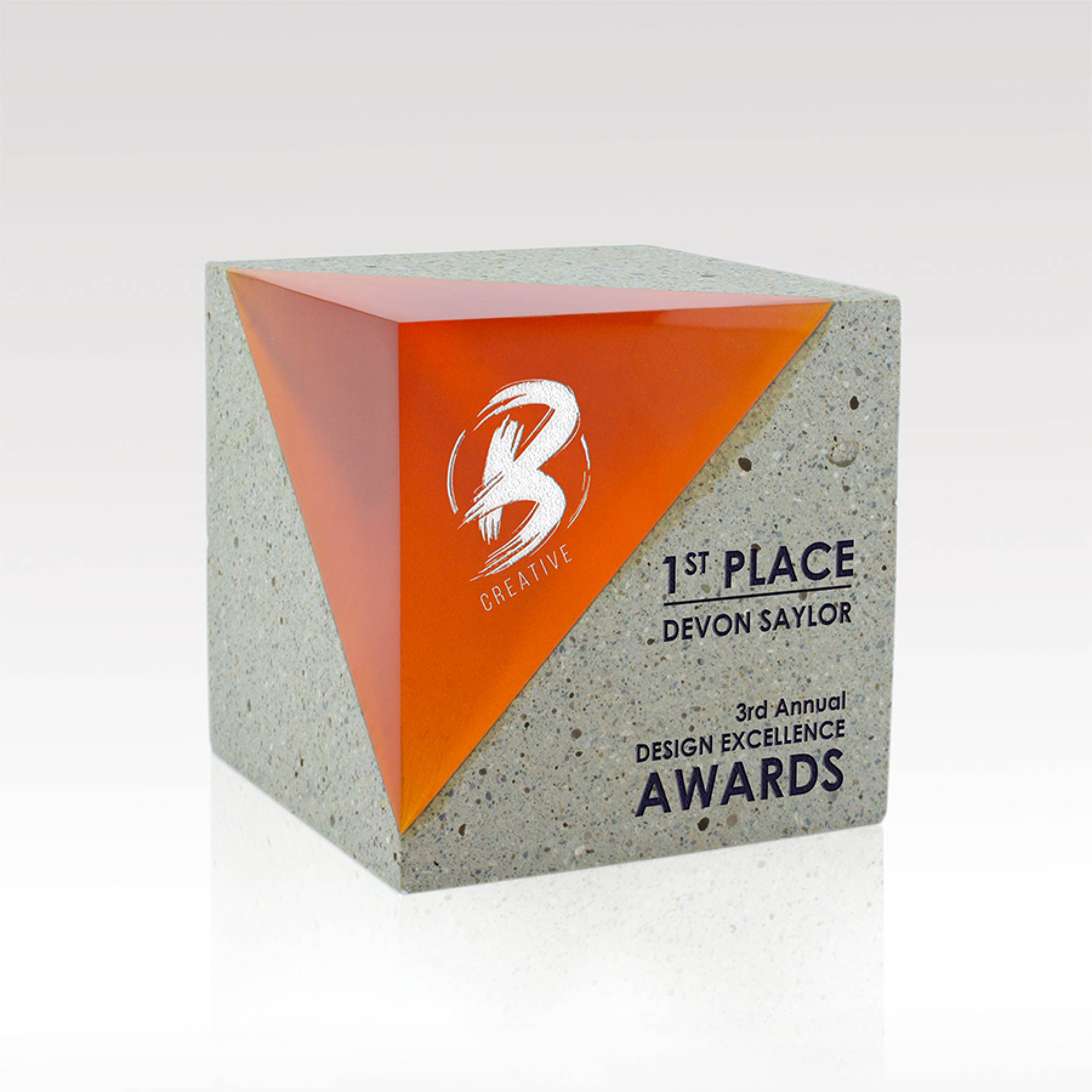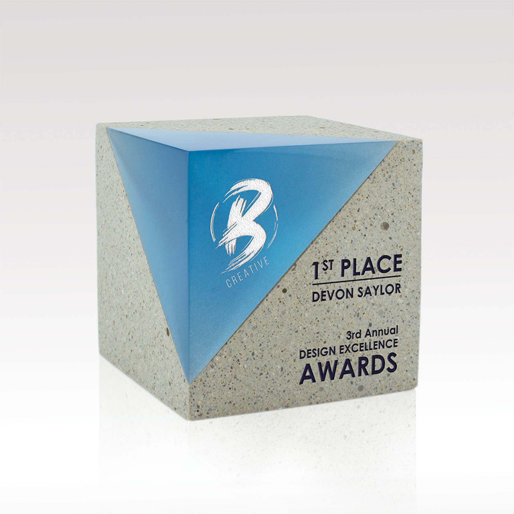 Atlas from the Cosmos Collection, in intriguing translucent resin, highlights this exclusive award. Select from four translucent colours to pair with the natural concrete, completing an enchanting cube shape.