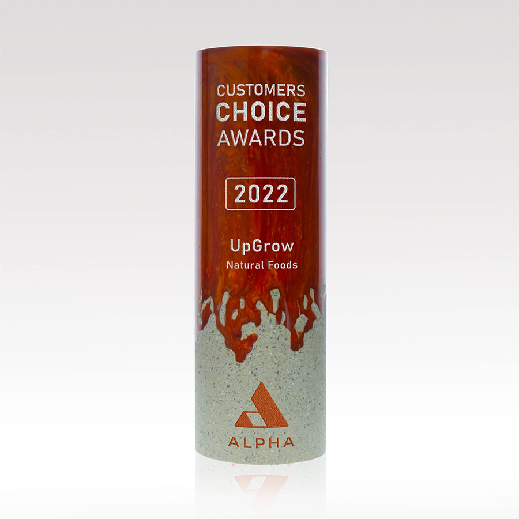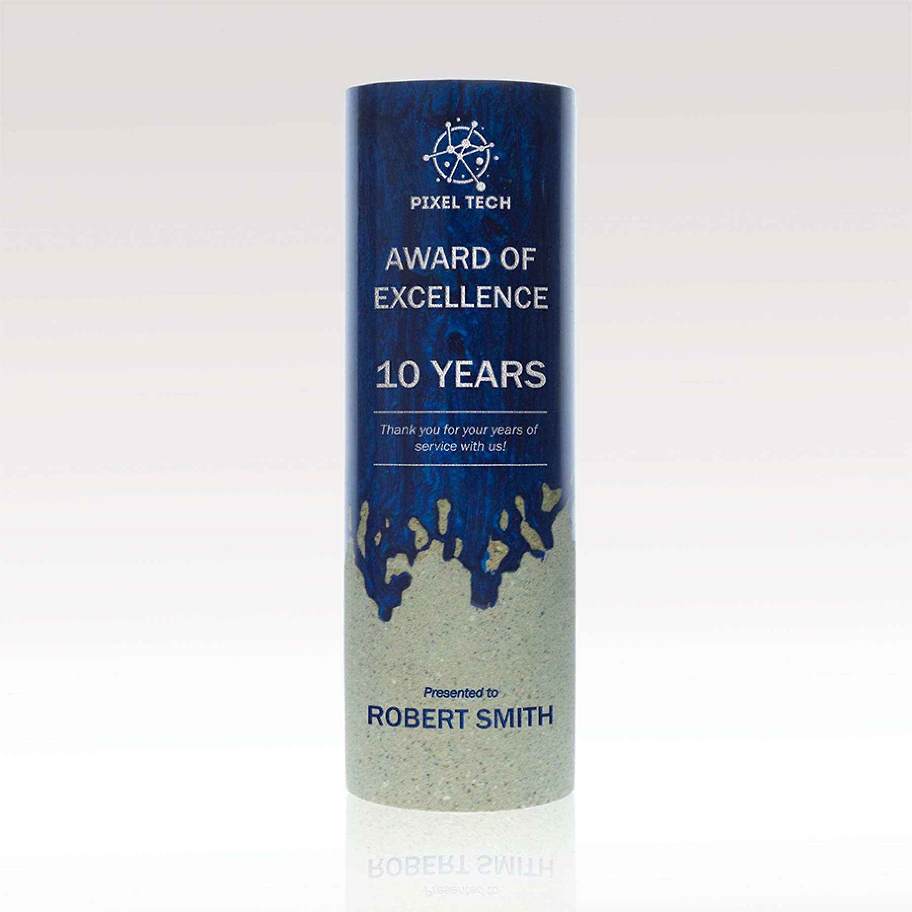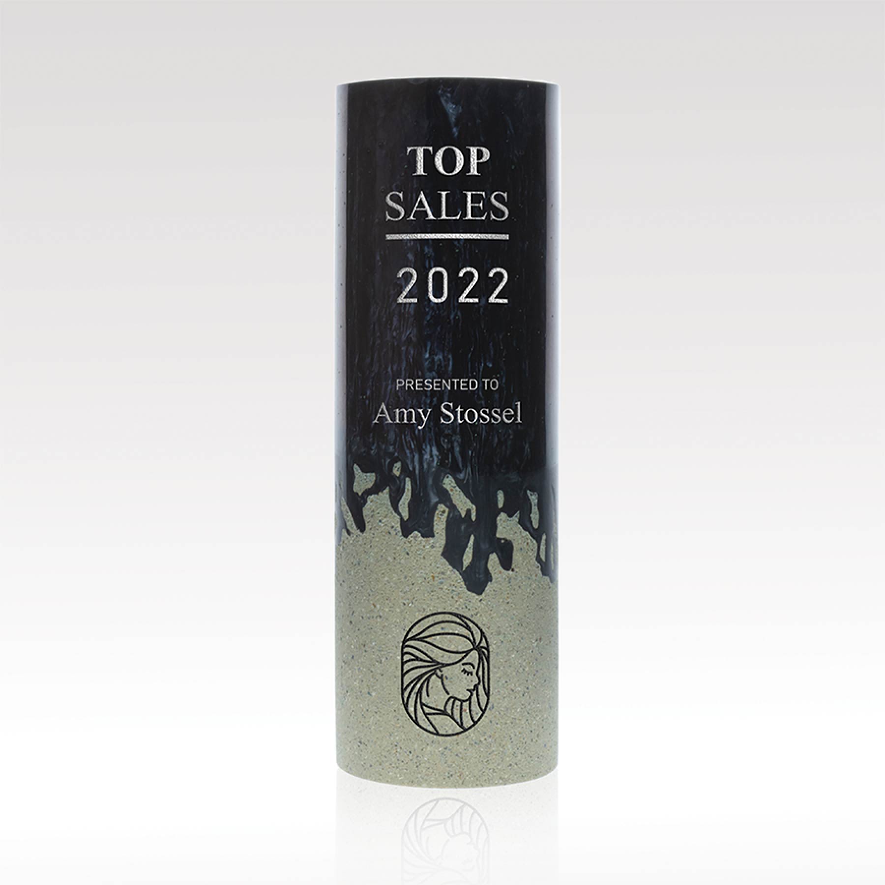 Pulsar from the Cosmos Collection, this sleek 8” high cylinder-shaped award features natural concrete paired with your choice of four colours of polished resin. Skilfully etched and colour-filled imprints carry your words of congratulations.